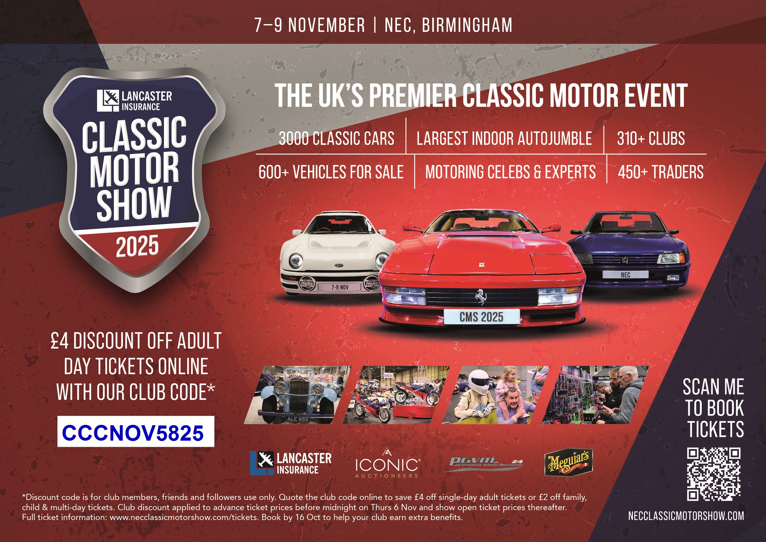 The code gives a £4.00 discount off single-day adult ticket prices or £2 off family, child & multi-day tickets. The club discount will be applied to Advance ticket prices before midnight on Thurs 7 Nov and Show Open ticket prices thereafter. Full ticket information at: www.necclassicmotorshow.com/ticket-information.